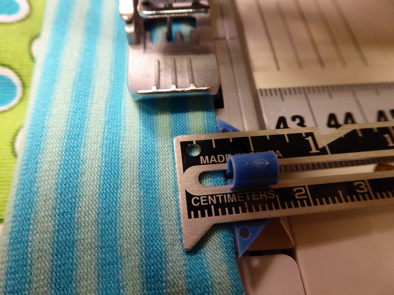 I attach the binding with the chain stitch using the centre needle, polyester all purpose sewing thread in the needle, woolly nylon in the looper and I sew at approx. 8 to 9 millimeters or 5/16” from the edge.