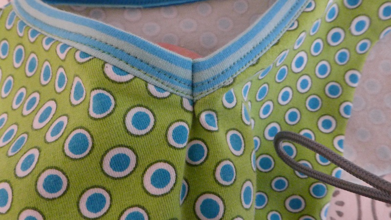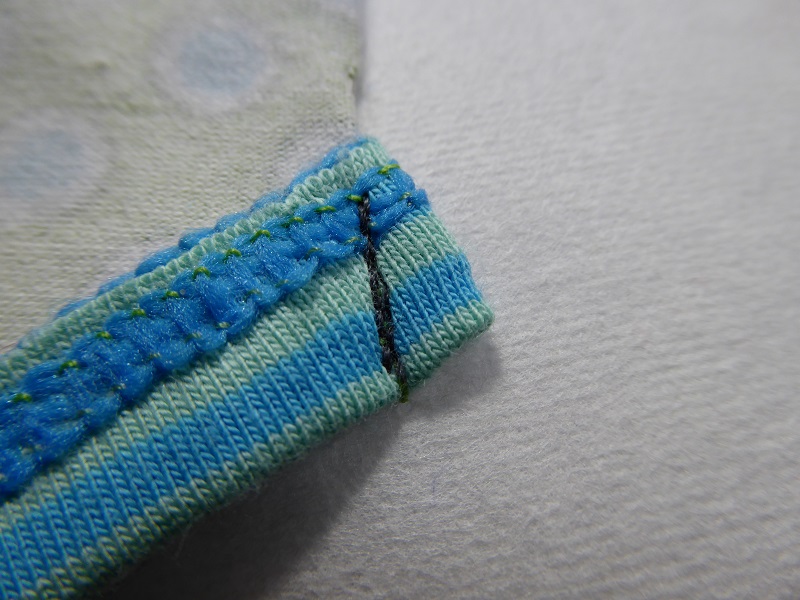Binding with the chain stitch works well when there is no need for maximum stretch: on pockets, T-shirts with wide necklines, armholes etc. If your children want to try and fit their knees into their pockets, I recommend a 2 needle coverstitch.