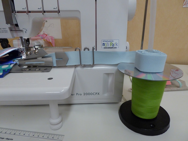 Next I add the left needle. I thread it with similar pes thread, fold over the binding and top stitch close to the left edge of the binding with a 2 needle narrow coverstitch.