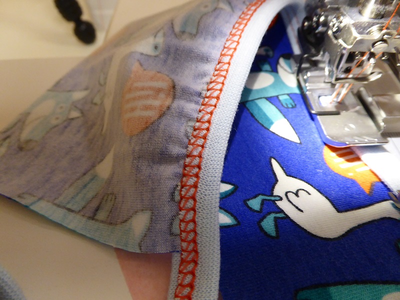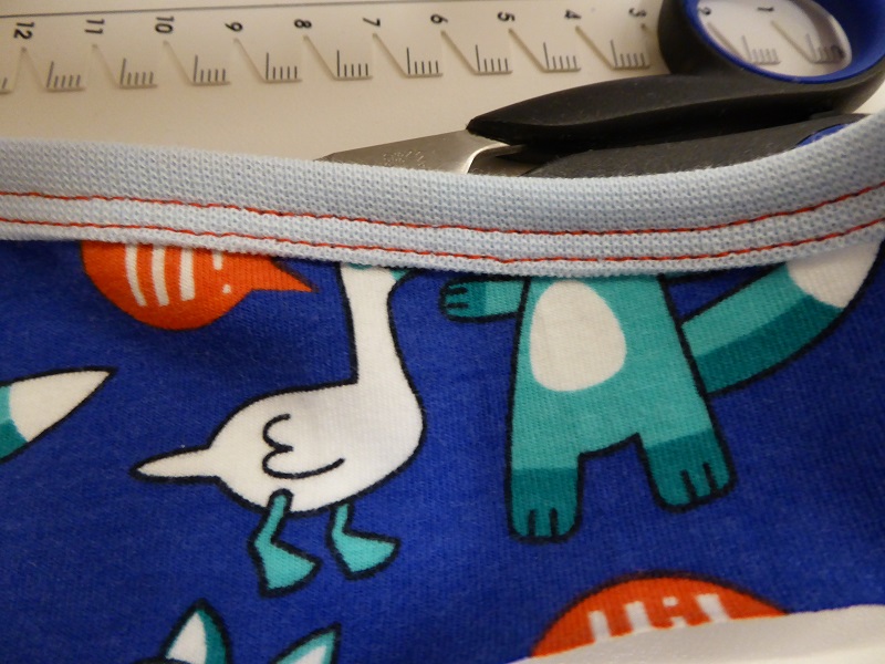 Binding with the chain stitch works well when there is no need for maximum stretch: on pockets, T-shirts with wide necklines, armholes etc. If your children want to try and fit their knees into their pockets, I recommend a 2 needle coverstitch. :-D