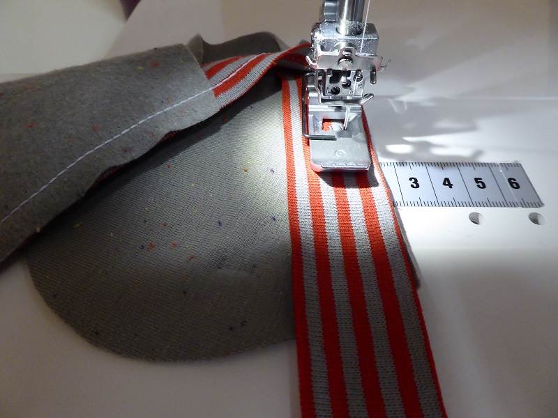 The drawstring also proves to be a perfect challenge for the Janome centre guide foot. Here again I am using a 2.6 cm / 1 1/32” wide strip of fabric cut parallel to the grain. This fabric is a 100% cotton knit and curling slightly towards the wrong side so I start with pressing it in half.