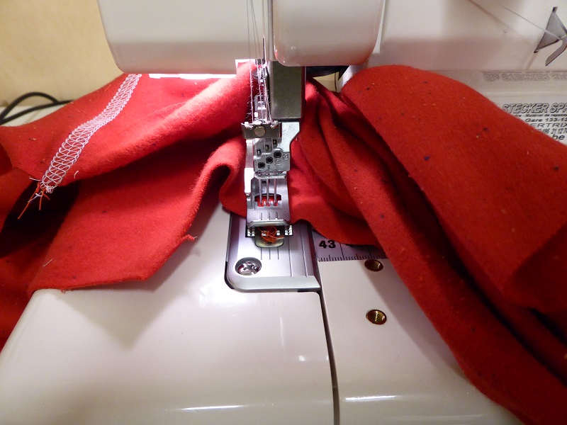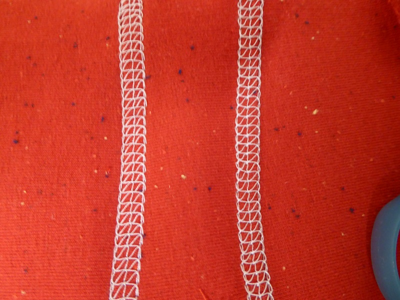 I am using the chain stitch on my Babylock Coverstitch machine with one needle in the right position. The needle is a ELX705 SUK size 90/14 and I have regular polyester sewing thread in the needle and woolly nylon in the looper.