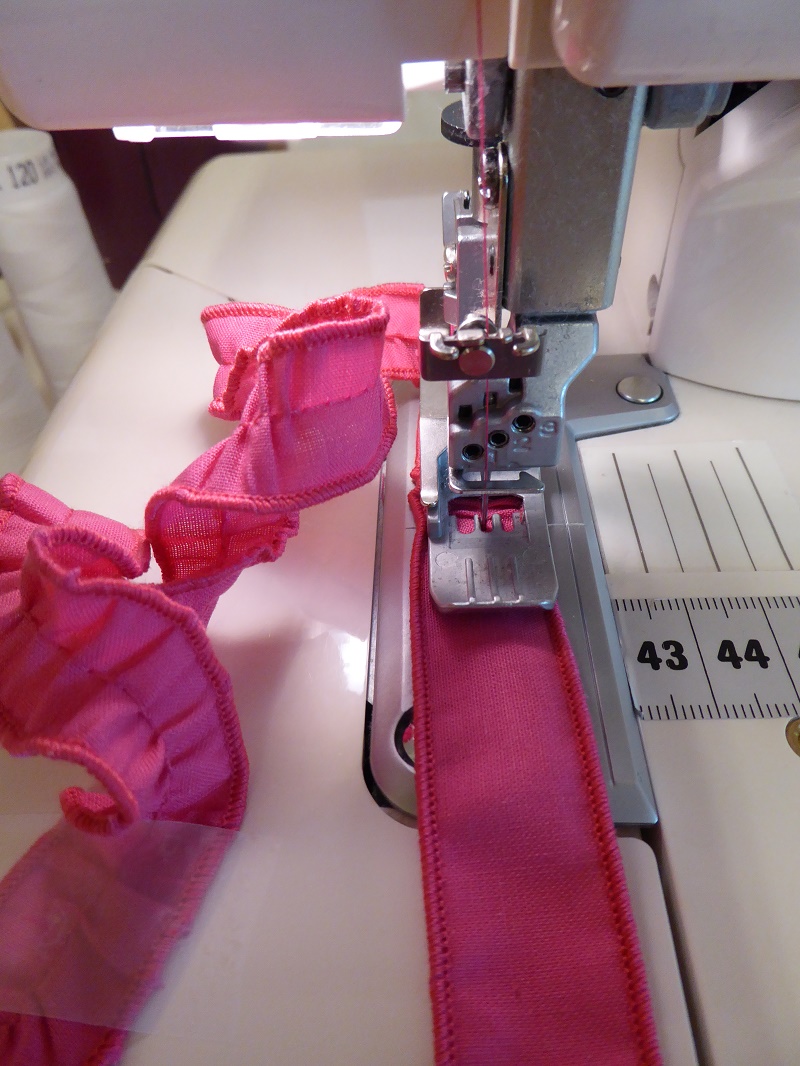 It is very easy to create meters of ruches using the coverstitch machine. Here I cut a 2,5cm / 1 inch wide strip of fabric and finished both edges with a rolled hem on my oberlocker. Then I increased the stitch length on the coverstitch machine to 4 and the differential setting to 2 and out came ruches ready to be attached as trim on a dress. In this case the ratio while gathering is not important but gathers can be increased or decreased by increasing the tension on the looper and or needle threads. In this case I am using regular pes overlock thread in the looper but with woolly nylon and increased tension on the looper, the gathers will be closer together. The strip of fabric can be cut any width but 2,5 cm / 1 inc is very easy to manipulate. When the machine sews these long stitches, the fabric tends to wiggle and shift left right but a strip this wide with rolled edges, stays nicely underneath the presser foot.