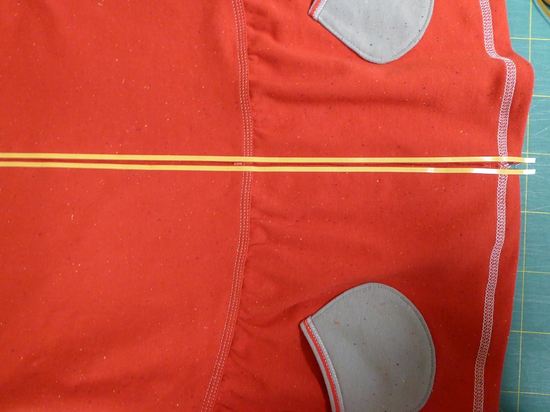 Home made drawstrings are a great way for using those narrow scraps of fabric and they add a unique look. In the next image I am making a drawstring for a maternity nightgown. I have cut a strip of cotton elastane knit parallel to the the grain, 2,6 cm/ 1 1/32“ wide.