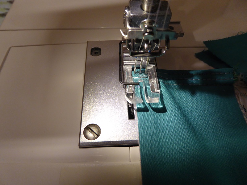 I am using Mettler Seracor sewing thread in the left needle and the looper and the needle is a 90/14 ELX705 SUK. I am just folding the fabric as I go and the trick here is to go slowly. When I say SLOWLY, I mean SLOOOOOOOWLYYYYYYYY.