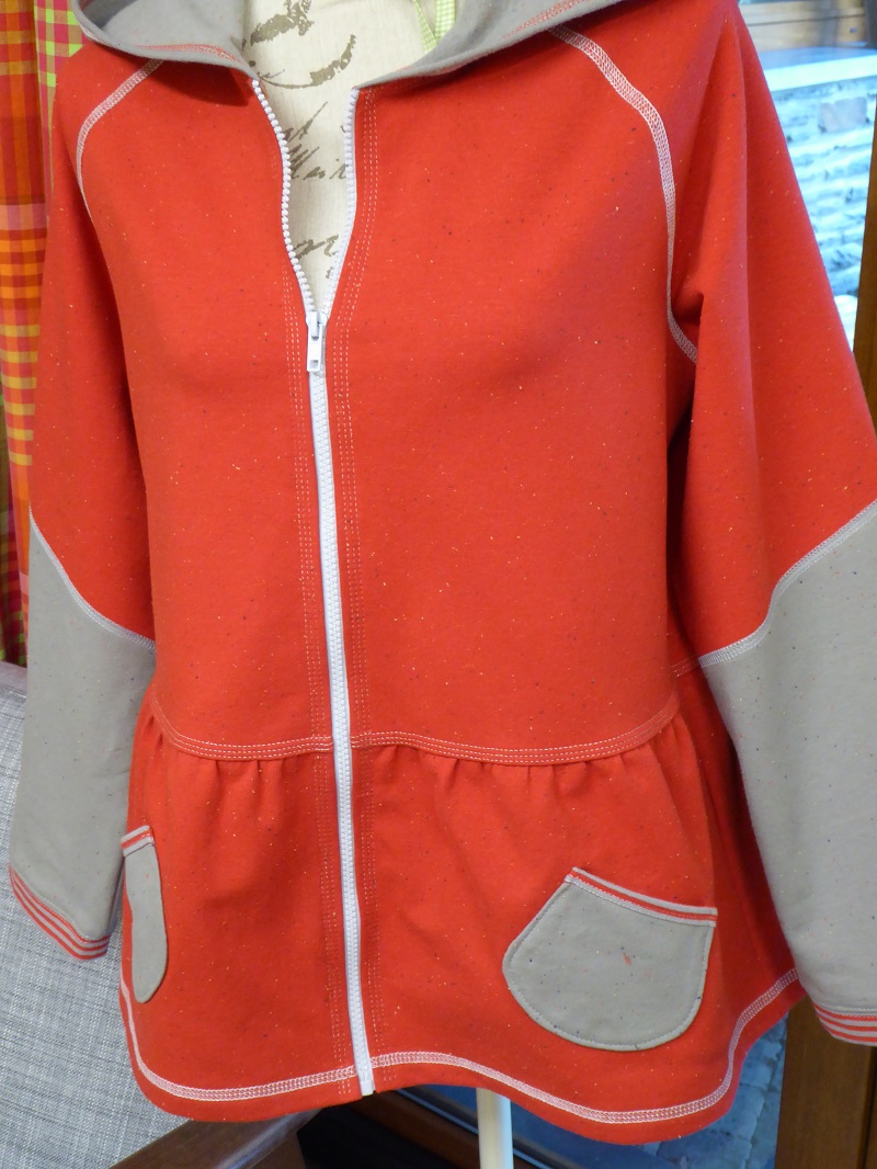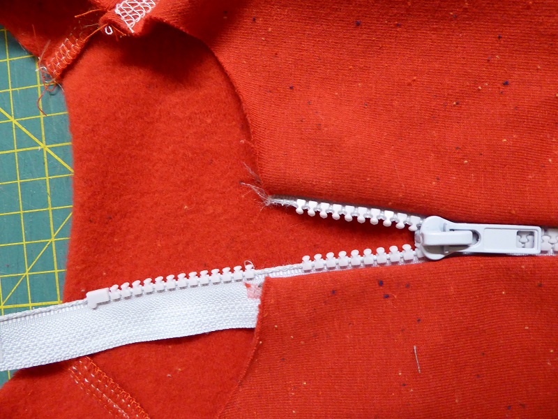 Before turning to the serger, I attached the extremities of the hood with a few stitches to the front of the jacket.