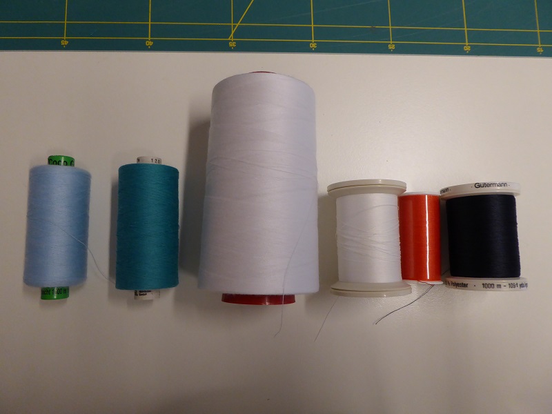 Please notice from left to right the light blue and turquoise spools with a paper core. The light blue always produces great results and the turquoise always causes some kind of irregularity. The difference is in the way the thread is wound. Notice the soft rounded edge on the light blue one and the straight edge on the turquoise one? The turquoise thread tends to get stuck briefly sometimes as it reaches the end of the spool before unwinding in the other direction. Sometimes placing the spool so that the thread unwinds counter clockwise lessens the risk of irregularities.