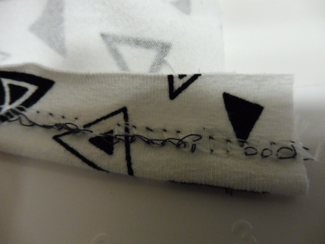 When starting to sew on the edge, f.ex. when stitching a tunnel for a drawstring or top stitching the edges of a jacket, I discovered that it is important to hold on to the threads while starting that first stitch. If there is not enough tension on the threads, the first stitches may not form properly. In the image below the stitching was supposed to start right on the edge.