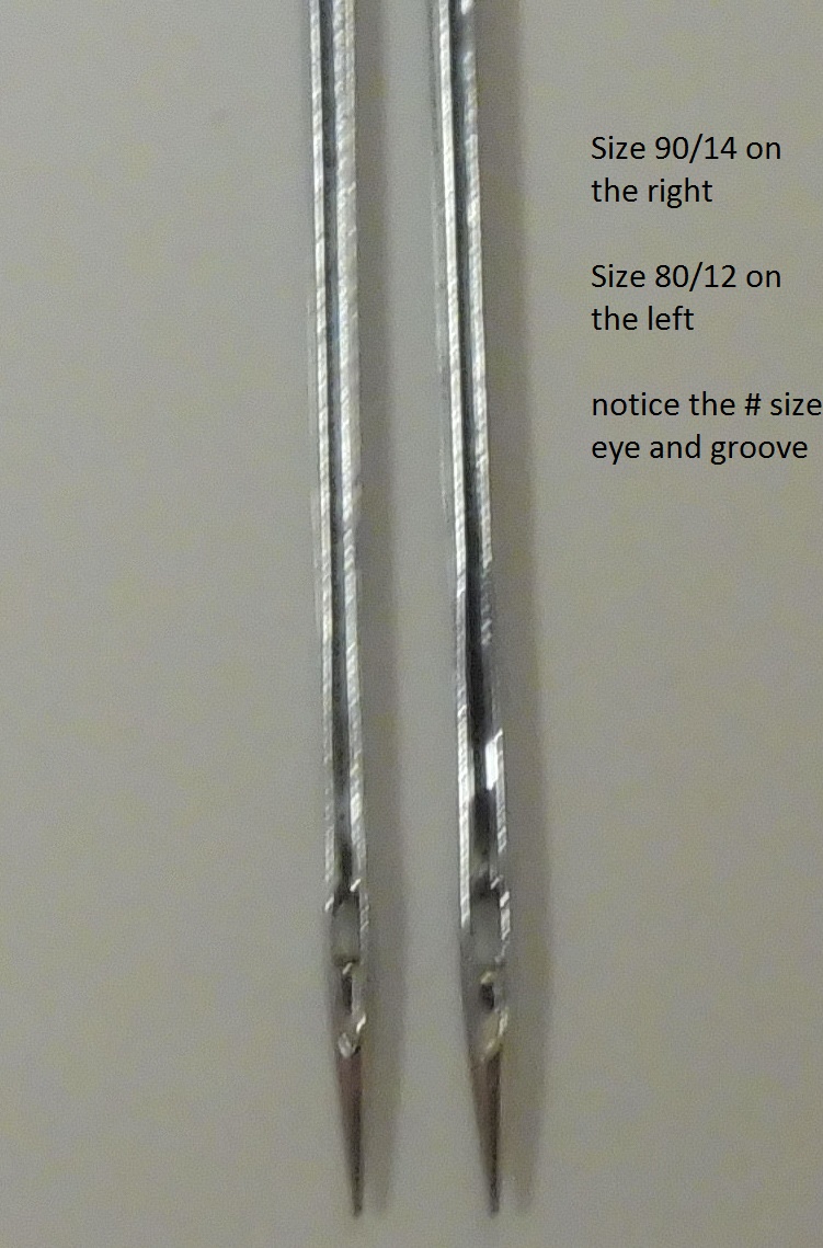One cause of skipped stitches is using the wrong size needle. When coverstitching, the thread has to move back and forth through the eye of the needle and along the groove in the front part of the shaft. When the needle is the right size for the thread, fabric and the number of layers, the eye and the groove are both large and wide enough to enable the needle thread to move freely. Strategy number one for me is to check my needle size and most of the time I use a size 90/14. I have used this successfully for knits and woven fabric such as denim. Please notice the difference in the size of the eye and the groove of the needles in the picture below, the one on the right hand is a size 90/14 and it has a larger eye and a wider groove.