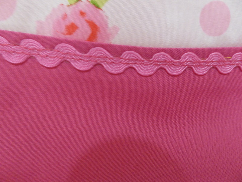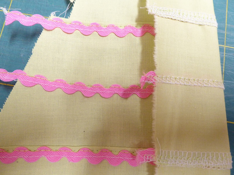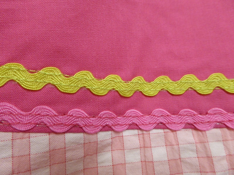 In the examples below I used my Babylock Coverstitch machine for top stitching woven fabric. The top image shows the 2 needle narrow coverstitch going over rick rack trim. This did NOT work well, I had several skipped stitches. The reason I used my BLCS machine was that I had the right color thread in it and my sewing machine was threaded with a different color for other parts of the same project. I was lazy and left the ELX705 SUK (ball point) size 90 needles in the machine and they did not work well on the woven cotton fabric and rick rack trim.